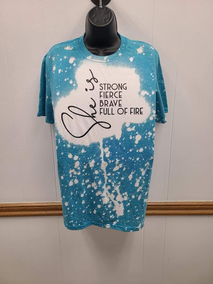 She Is Bleached Tee This bright blue bleached tee will have you feeling like everything listed! She is Distressed and tie dye tees are one of a kind due to their processes. These are processed individually by hand and are subject to variation in color and placement.