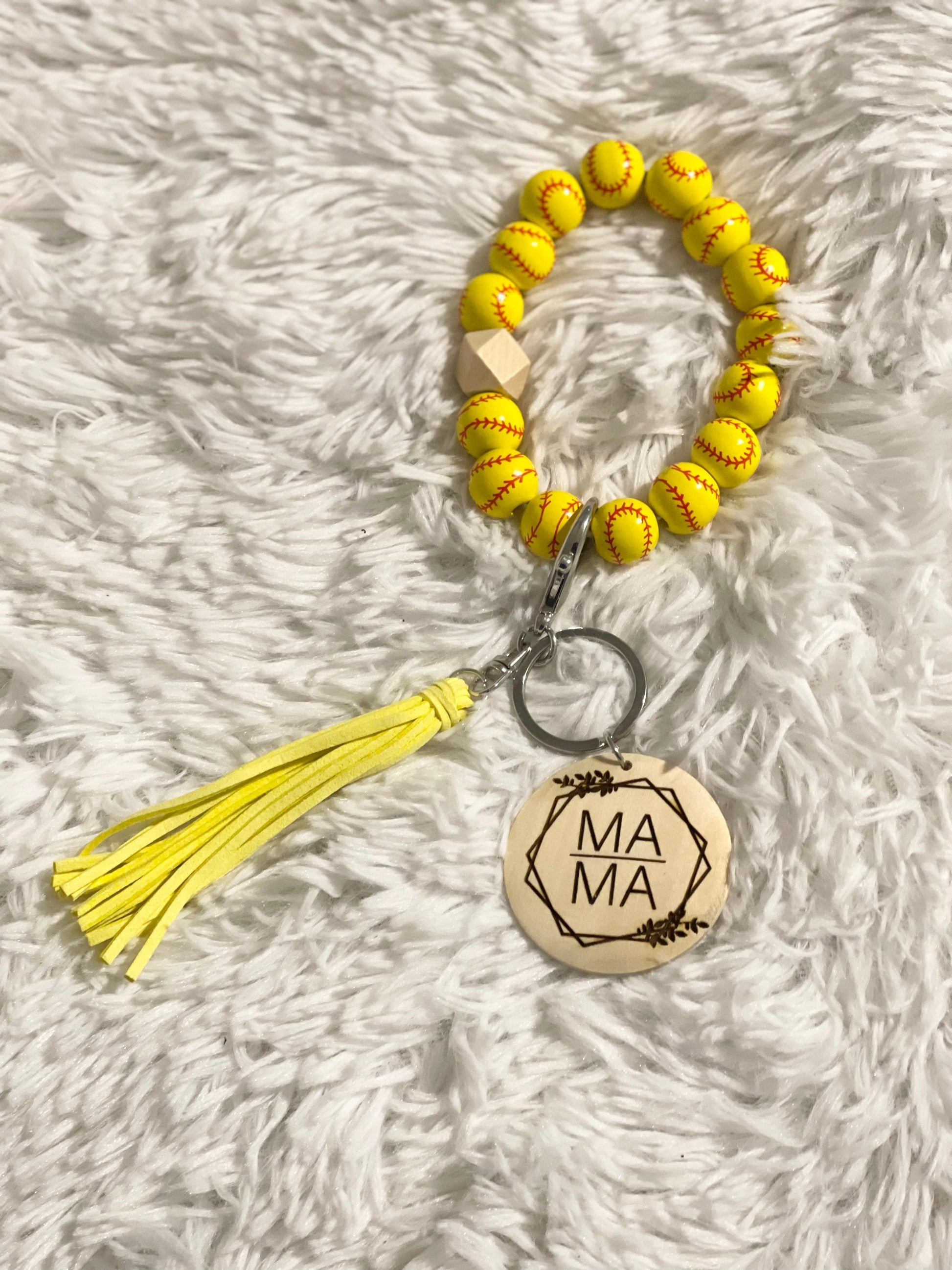 Wooden beads with suede tassel, an approximately 2 inch wood pendant silver keyring and lobster claw clasp.
